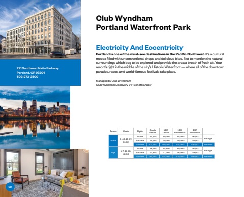Managed by Club WyndhamClub Wyndham Discovery VIP Benefits ApplyClub Wyndham Portland Waterfront ParkSeason Weeks Nights StudioDeluxe1 BRDeluxe1 BRPresidential2 BRPresidentialPrime 8-43, 46-47, 51-52Fri-Sat 41,500 50,000 65,000 90,000Per NightSun-Thur 24,000 30,000 39,000 54,000Full Week 203,000 250,000 325,000 450,000 Per WeekHigh 1-7, 44-45, 48-50Fri-Sat 38,000 44,500 60,000 80,000Per NightSun-Thur 22,600 27,000 36,000 48,000Full Week 189,000 224,000 300,000 400,000 Per Week221 Southwest Naito ParkwayPortland, OR 97204503-273-3500 Electricity And EccentricityPortland is one of the must-see destinations in the Pacific Northwest. It%u2019s a cultural mecca filled with unconventional shops and delicious bites. Not to mention the natural surroundings which beg to be explored and provide the area a breath of fresh air. Your resort%u2019s right in the middle of the city%u2019s Historic Waterfront %u2014 where all of the downtown parades, races, and world-famous festivals take place.92
