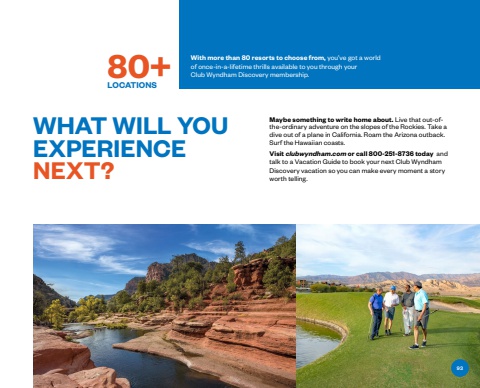80+LOCATIONSWith more than 80 resorts to choose from, you%u2019ve got a world of once-in-a-lifetime thrills available to you through your Club Wyndham Discovery membership.WHAT WILL YOU EXPERIENCE NEXT?Maybe something to write home about. Live that out-ofthe-ordinary adventure on the slopes of the Rockies. Take a dive out of a plane in California. Roam the Arizona outback. Surf the Hawaiian coasts.Visit clubwyndham.com or call 800-251-8736 today and talk to a Vacation Guide to book your next Club Wyndham Discovery vacation so you can make every moment a story worth telling.93