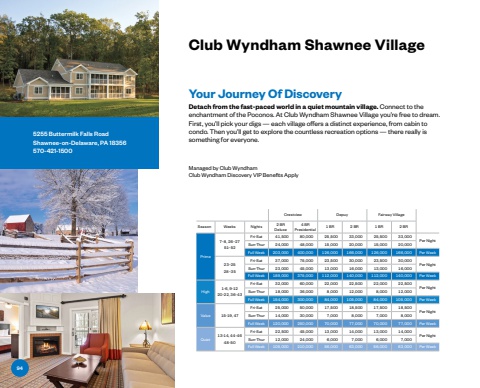 Managed by Club WyndhamClub Wyndham Discovery VIP Benefits ApplyClub Wyndham Shawnee Village5255 Buttermilk Falls RoadShawnee-on-Delaware, PA 18356570-421-1500Your Journey Of DiscoveryDetach from the fast-paced world in a quiet mountain village. Connect to the enchantment of the Poconos. At Club Wyndham Shawnee Village you%u2019re free to dream. First, you%u2019ll pick your digs %u2014 each village offers a distinct experience, from cabin to condo. Then you%u2019ll get to explore the countless recreation options %u2014 there really is something for everyone.Crestview Depuy Fairway VillageSeason Weeks Nights 2 BRDeluxe4 BR Presidential 1 BR 2 BR 1 BR 2 BRPrime7%u20138, 26%u20132751%u201352Fri-Sat 41,500 80,000 25,500 33,000 25,500 33,000 Per NightSun-Thur 24,000 48,000 15,000 20,000 15,000 20,000Full Week 203,000 400,000 126,000 166,000 126,000 166,000 Per Week23%u20132528%u201335Fri-Sat 37,000 75,000 23,500 30,000 23,500 30,000Per NightSun-Thur 23,000 45,000 13,000 16,000 13,000 16,000Full Week 189,000 375,000 112,000 140,000 112,000 140,000 Per WeekHigh 1-6, 9-1220-22, 36-43Fri-Sat 32,000 60,000 22,000 22,500 22,000 22,500 Per NightSun-Thur 18,000 36,000 8,000 12,000 8,000 12,000Full Week 154,000 300,000 84,000 105,000 84,000 105,000 Per WeekValue 15-19, 47Fri-Sat 25,000 50,000 17,500 18,500 17,500 18,500 Per NightSun-Thur 14,000 30,000 7,000 8,000 7,000 8,000 Full Week 120,000 250,000 70,000 77,000 70,000 77,000 Per WeekQuiet 13-14, 44-46 48-50Fri-Sat 22,500 45,000 13,000 14,000 13,000 14,000 Per NightSun-Thur 12,000 24,000 6,000 7,000 6,000 7,000Full Week 105,000 210,000 56,000 63,000 56,000 63,000 Per Week94